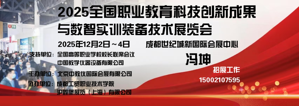 为深入学习贯彻新时代中国特色社会主义思想和党的二十大精神,落实教育强国建设、发展新质生产力重要指示,推动职业教育装备现代化、数字化、绿色化发展,深化职普融通、产教融合、科教融汇,加快现代产业体系建设,现将在全国高等职业学校校长联席会议年会召开期间,北京中教仪国际会展有限公司拟于2025年12月2-4日在四川成都市举办“职业教育科技创新成果与数智实训装备技术展览会”。具体内容如下: